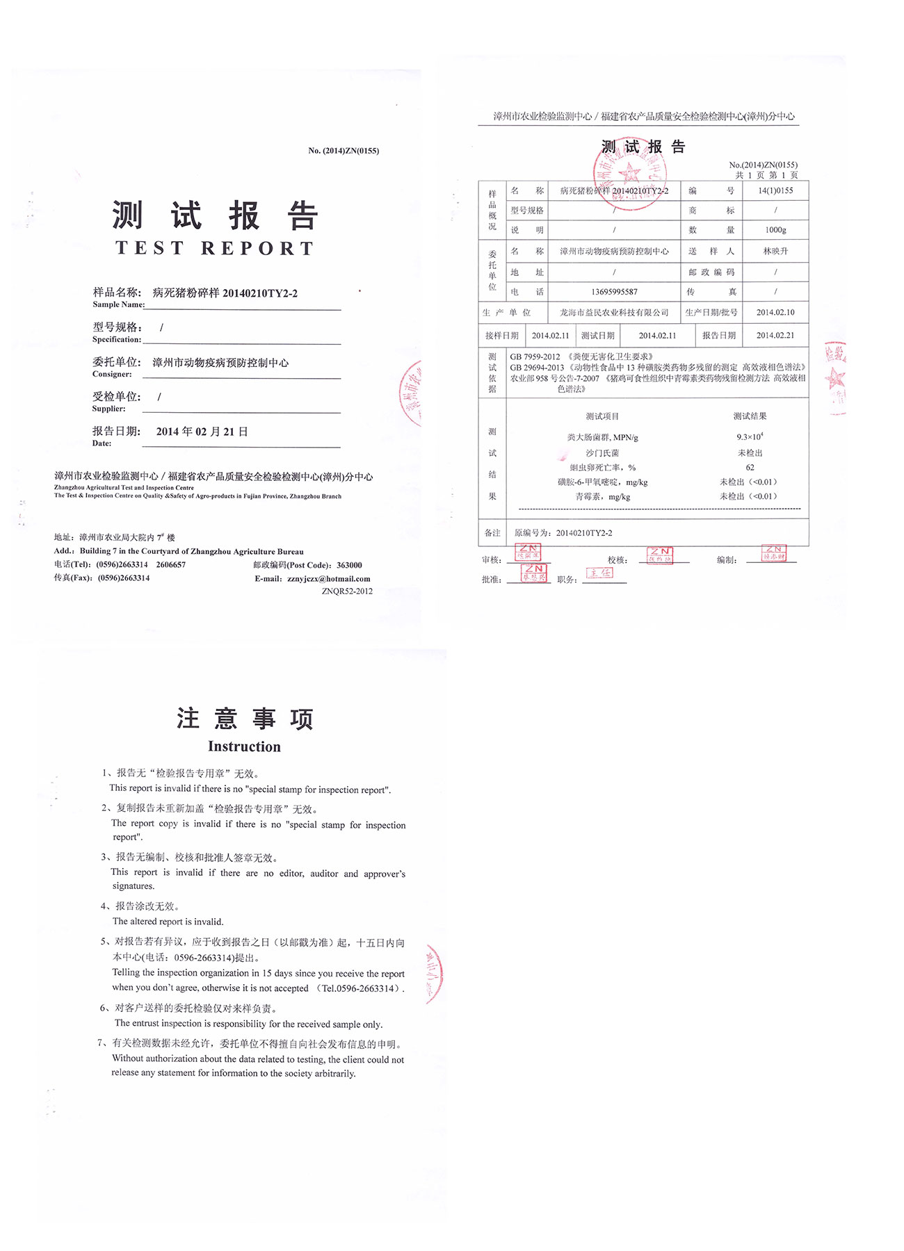 漳州市農(nóng)業(yè)檢驗檢測中心測試報告--病死豬粉碎樣