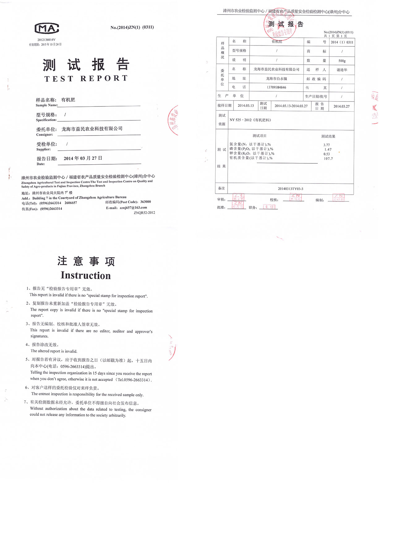 漳州市農(nóng)業(yè)檢驗(yàn)檢測中心測試報告 有機(jī)肥2