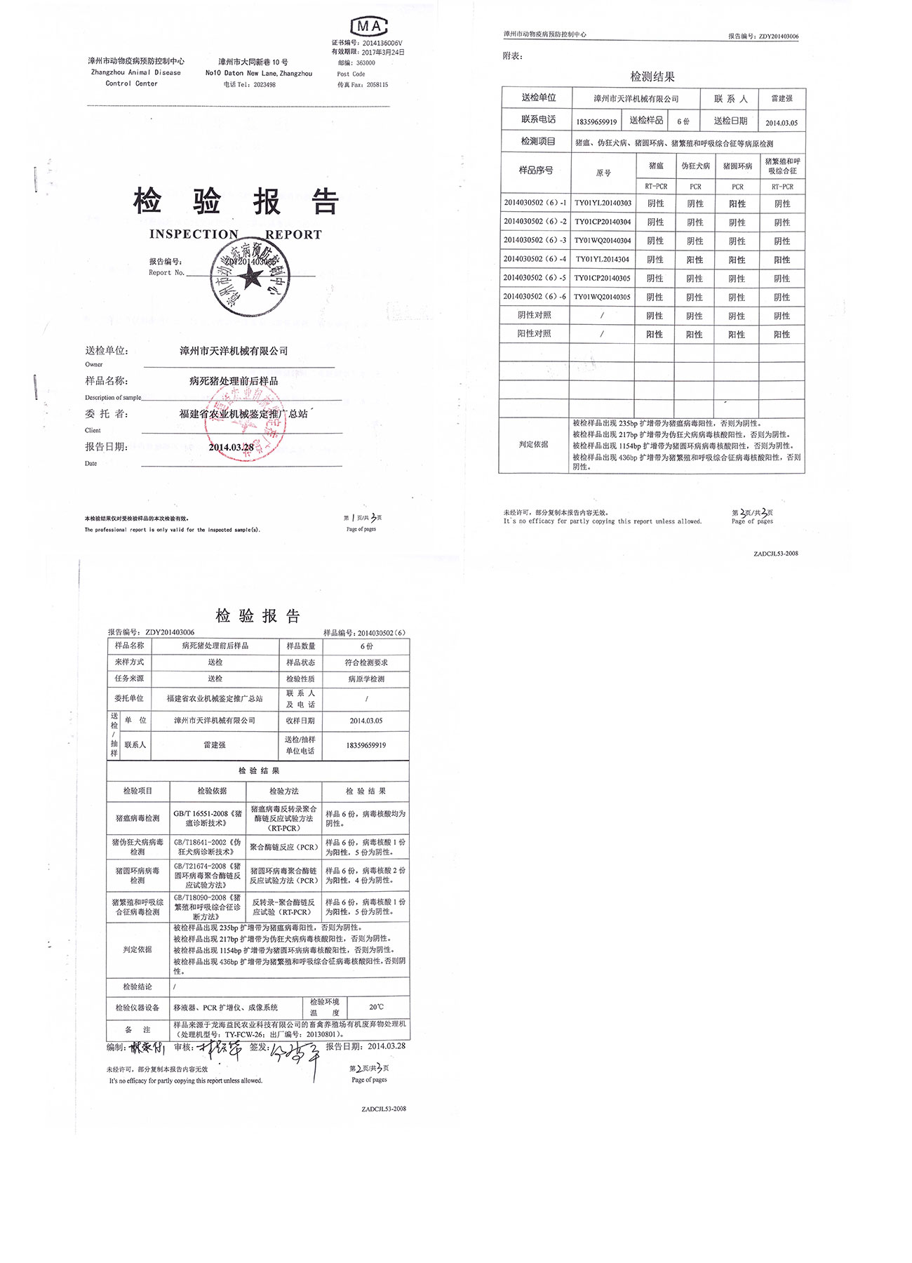 漳州市動(dòng)物疫病預(yù)防控制中心檢驗(yàn)報(bào)告--病死豬1